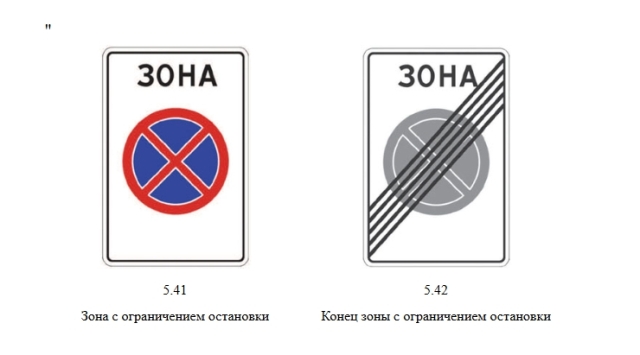 5.41 «Зона с ограничением остановки» и 5.42 «Конец зоны с ограничением остановки» — раньше на дорогах уже встречались знаки, обозначающие начало и конец зоны с запретом стоянки. Теперь появятся аналогичные знаки, касающиеся остановки. Между ними запрещаются и остановка, и стоянка транспортных средств. Подробнее об отличиях этих маневров читайте здесь.