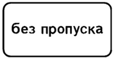 8.27 «Без пропуска» — применяется совместно с определенными запрещающими знаками 3.1 — 3.4, 3.11, 3.12, 3.34. Информирует водителей о том, что, несмотря на действие указанного запрещающего знака, дальнейшее движение или стоянка / остановка разрешены исключительно для транспортных средств, имеющих специальный пропуск.